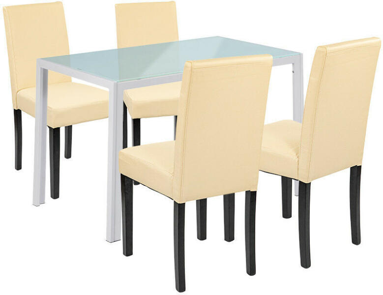 Leziter Mira 4+1 Étkezőgarnitúra: Modern elegancia és kényelem fehér-bézs színben ?️ Ez a stílusos étkezőgarnitúra tökéletes választás azoknak, akik modern, kényelmes és könnyen tisztítható bútorokat keresnek. A fehér üveg asztal és a bézs ECO bőr székek elegáns kombinációt alkotnak, amely feldobja étkezőjét. Az asztal: 120x70x74 cm méretű, hőkezelt, 8 mm vastag edzett üveglap Strapabíró fém váz, korrózióálló bevonattal Könnyen tisztítható felület A székek (4 db): Kényelmes, bézs ECO bőr kárpitozás 4 cm vastag habszivacs ülőfelület Stabil fenyőfa lábak (120 kg teherbírás) Könnyen tisztítható Előnyök:Modern design: Friss, elegáns megjelenés. Kényelmes: Vastag habszivacs ülőfelület a hosszú vacsorákhoz is. Könnyen tisztítható: Az üveg és az ECO bőr könnyen ápolható. Stabil és tartós: Minőségi anyagokból készült, hosszú élettartamú. Ideális kisebb terekbe: Kompakt méret, mégis kényelmes. Méretek:Termék MéretAsztal 120x70x74 cmSzék 40x48x90 cmÉlvezze a családi vacsorákat és baráti összejöveteleket ebben a stílusos és kényelmes étkezőgarnitúrában!