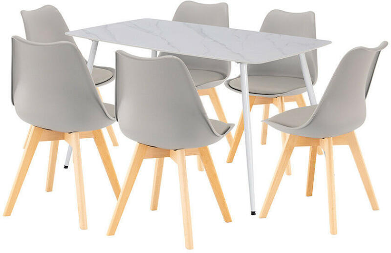 Ravena 6+1 Étkezőgarnitúra: Elegáns étkezés szinterezett kő asztallal és kényelmes székekkel ?️ A Ravena 6+1 étkezőgarnitúra tökéletes választás, ha modern, tartós és stílusos étkezőbútort keresel. A szett egy Bora 140 cm-es szinterezett kő étkezőasztalból és hat darab Silla szürke étkezőszékből áll, így ideális 6 fős családoknak vagy baráti összejövetelekhez. Az asztal főbb jellemzői:Méret: 140 x 80 x 75 cm Anyag: Szinterezett kő (Stoneis technológia) - karcálló, foltálló és hőállóFelület: Palakő hatású, természetes textúra Lábak: Fehérre festett fém, műanyag padlóvédőkkel Stílus: Modern, minimalista A székek főbb jellemzői:Szín: Szürke Anyag: Polipropilén (PP) ülőfelület, szürke PVC párnázat Lábak: Bükkfa színű Méretek: Magasság 81 cm, szélesség 49 cm, ülésmélység 43 cm, ülőmagasság 45 cm Teherbírás: 120 kg Kényelem: Könnyen tisztítható, extra kényelmet nyújtó párnázat Miért válaszd a Ravena étkezőgarnitúrát?Tartósság: A szinterezett kő asztallap ellenáll a mindennapi használatnak, a karcolásoknak, foltoknak és a hőnek. Kényelem: A Silla székek ergonomikus kialakításúak és kényelmes párnázattal rendelkeznek. Stílus: A fehér asztal és a szürke székek kombinációja elegáns és időtálló. Praktikusság: Az asztal 6 személy számára ideális, a székek pedig könnyen tisztíthatók. Kinek ajánljuk? Akik modern és tartós étkezőbútort keresnek. Kisebb és közepes méretű otthonokba, ahol fontos a helytakarékos, de kényelmes megoldás. Családoknak és pároknak, akik tartós, kényelmes és praktikus étkezőszettet keresnek. Tedd otthonodat elegánsabbá és kényelmesebbé a Ravena 6+1 étkezőgarnitúrával! ✨