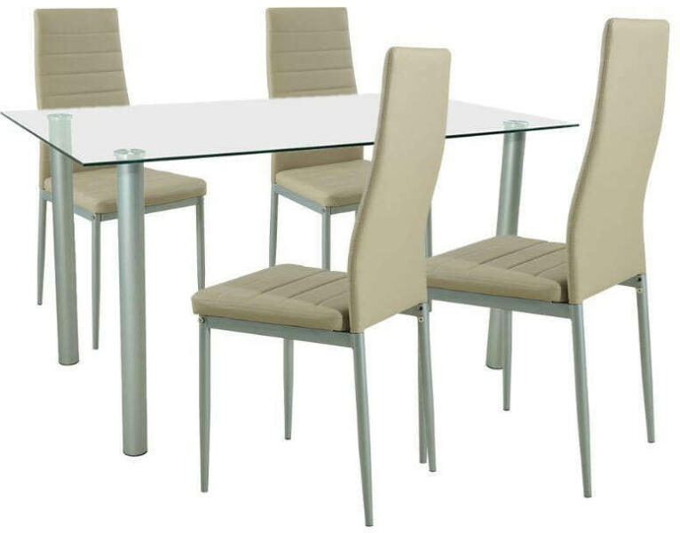 Verna 4+1 étkező garnitúra bézs-szürkeVerna 4+1 Étkező Garnitúra Bézs-SzürkeModern eleganciát és kényelm a Verna ÉtkezőgarnitúrávalJellemzőBerna ÉtkezőasztalTino NOVA ÉtkezőszékDesignModern, elegáns, szögletes formaElegáns, bézs-szürke színkombináció, szürke vas lábakAnyagHőkezelt üveglap, fém lábakbézs színű ülőfelület, szürke porfestett vas lábakMéretekMagasság: 75 cm, Hossz: 140 cm, Szélesség: 80 cmmagasság 96 cm, szélessége 50 cm, mélysége 41 cm, ülőmagassága 45 cmSzínÁtlátszó (üveg) és fémes elemekBézs ülőfelület, szürke lábakTartósságKarcolásálló hőkezelt üveg, tartós fém lábakTartós anyagok, kényelmes és strapabíró ülőfelületStílusModern és minimalistaModern és stílusos, megjelenésKényelemKényelmes és tágas étkezőhelyKényelmes ülőfelület, ergonomikus kialakításFunkcionalitásIdeális méretek a családi étkezésekhezIdeális méretek az étkezőasztalokhoz, könnyen illeszkedik különböző stílusokhozTisztíthatóságKönnyen tisztítható üveg és fém felületekKönnyű tisztíthatóság, tartós anyagokIlleszkedésKönnyen illeszkedik különböző belső terekhezStílusos és könnyen illeszthető más enteriőr elemekhezBerna ÉtkezőasztalModern elegancia: A Berna 140 cm szögletes étkezőasztal modern megjelenéssel és elegáns kivitelben készült, ideális választás minden étkezőbe vagy konyhába. Kiváló anyagok: Hőkezelt üveg asztallapja tartósságot és könnyű tisztíthatóságot kínál. Az üveg ellenálló a karcolásokkal és kisebb sérülésekkel szemben. Praktikus lábvédelem: Fém lábak garantálják a stabilitást, műanyag gyűrűkkel a lábak alján, amik védenek a padlót a sérülésektől és kopástól. Ideális méretek: Magasság: 75 cm, Hossz: 140 cm, Szélesség: 80 cm. Tino NOVA ÉtkezőszékElegáns design: A Tino NOVA étkezőszék bézs-szürke színkombinációjában kifinomult eleganciát sugároz. A bézs ülőfelület és szürke vas lábak tökéletes harmóniát alkotnak. Magas minőség: A bézs színű ülőfelület és háttámla tartós, könnyen tisztítható anyagokból készült, míg a szürke porfestett vas lábak stabil tartást biztosítanak. Optimális méretek: Magassága 96 cm, szélessége 50 cm, mélysége 41 cm, ülőmagassága 45 cm. Ideális méretek az étkezőasztalokhoz. Színkombináció: A szürke és bézs színkombináció stílusos megjelenést kölcsönöz, könnyen illeszthető más enteriőr elemekhez. Az asztal üveg vastagsága: 8 mm edzett üveg. Terhelhetősége 60 kg. Szék terhelhetősége 130 kg. A Berna asztal és a Tino NOVA székek kombinációja elegáns és kényelmes megoldást kínál minden otthonba. Válassz Verna garnitúrát, hogy étkeződ vagy konyhád a stílus és kényelem tökéletes keverékévé váljon!