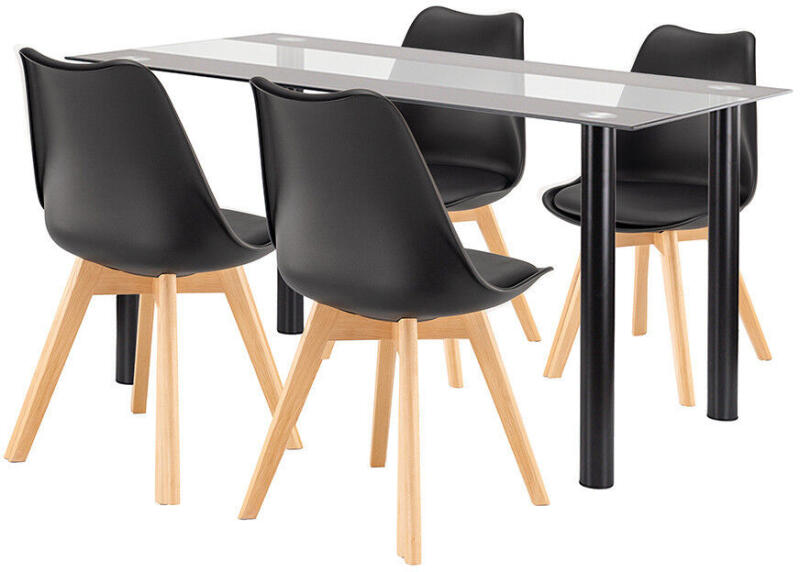 Zelma Fekete Étkezőgarnitúra: Modern elegancia a mindennapokra ?️ A Zelma 4+1 étkezőgarnitúra tökéletes választás, ha egy modern, stílusos és praktikus étkezőt szeretnél. A szett tartalmaz egy Riona üveg étkezőasztalt és négy Silla étkezőszéket, melyek harmonikus egységet alkotnak. Az asztal főbb jellemzői:Méret: 140 x 80 x 75 cm - Ideális 4-6 személy számára. Asztallap: 8 mm vastag, edzett üveg - Karcálló és könnyen tisztítható ✨. Váz: Fekete, porszórt acél - Stabil és időtálló. Teherbírás: 60 kg Dizájn: Letisztult és modern, bármilyen enteriőrbe illik. A székek főbb jellemzői:Szín: Fekete - Elegáns és könnyen kombinálható. Anyag: Polipropilén (PP) ülőfelület, fekete PVC párnázat - Kényelmes és könnyen tisztítható. Lábak: Bükkfa színű - Természetes hatás és stabilitás. Méretek: Magasság 81 cm, szélesség 49 cm, ülésmélység 43 cm, ülőmagasság 45 cm Teherbírás: 120 kg Kényelem: Extra kényelmet nyújtó párnázat. Miért válaszd a Zelma étkezőgarnitúrát?Modern design: A fekete üveg asztal és a fekete székek kombinációja elegáns és időtálló. Strapabíró anyagok: Az asztal edzett üveglapja és a székek erős váza hosszú élettartamot biztosít. Kényelmes használat: A székek ergonomikus kialakítása és a párnázott ülőfelület kényelmes étkezést tesz lehetővé. Könnyű tisztítás: Az üveg asztallap és a műanyag székek könnyen tisztán tarthatók. Ideális méret: A 140 cm-es asztal 4-6 személy számára nyújt elegendő helyet. Kinek ajánljuk? Akik modern és letisztult étkezőgarnitúrát keresnek. Kisebb és közepes méretű otthonokba, ahol fontos a helytakarékosság. Családoknak és pároknak, akik mindennapi használatra is kényelmes és tartós bútort szeretnének. Varázsold elegánsabbá étkeződet a Zelma garnitúrával! ✨