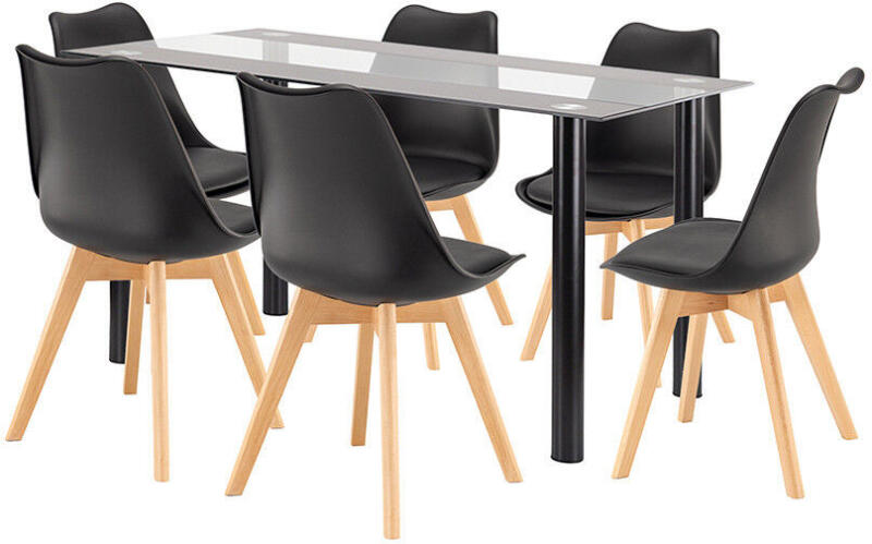 Zelma 6+1 étkező garnitúra feketeZelma 6+1 étkezőgarnitúra fekete-fekete – modern üveg asztal és kényelmes székek tökéletes harmóniájaFőbb jellemzők – Silla étkezőszék (6 db):Szín: feketeAnyag: polipropilén (PP) ülőfelület, fekete PVC párnázatLábak: bükkfa színű, stabil és tartósMéretek: magasság 81 cm, szélesség 49 cm, ülésmélység 43 cm, ülőmagasság 45 cmTeherbírás: 120 kgKönnyen tisztítható, extra kényelmet nyújtó párnázatFőbb jellemzők – Riona 140 cm szögletes üveg étkezőasztal (1 db):Méret: 140 × 80 × 75 cmAnyag: 8 mm vastag edzett üveg asztallapVáz: fekete, porszórt acélTeherbírás: 60 kgKönnyen tisztítható, karcálló, modern felületLetisztult, időtálló dizájnZelma étkezőgarnitúra fekete-fekete színben – elegáns megoldás minden otthonbaA Zelma 6+1 étkezőgarnitúra fekete-fekete modern stílusával és időtálló kialakításával tökéletes választás, ha étkeződet egy prémium, mégis praktikus bútorszettel szeretnéd berendezni. A szett egy Leziter Riona 140 cm üveg étkezőasztalt és négy darab Silla fekete széket tartalmaz, amelyek együtt harmonikus megjelenést biztosítanak. Riona 140 cm üveg étkezőasztal fekete vázzal – stabil és modern asztalA Riona üveg étkezőasztal 8 mm vastag edzett üveglappal készült, amely karcálló és könnyen tisztítható. A porszórt acél váz modern fekete színben hosszú távú stabilitást ad, miközben elegáns, minimalista stílust kölcsönöz az étkezőnek. A 140x80 cm-es méret kényelmes helyet biztosít 6 fő számára, így ideális mindennapi vacsorákhoz és vendégfogadáshoz. Silla fekete étkezőszékek – kényelmes és időtlen designA garnitúrához tartozó Silla étkezőszékek fekete árnyalatban világossá és barátságossá teszik az étkezőt. Az ergonomikus kialakítás, a polipropilén ülőfelület és a szintetikus bőrhatású párnázat kényelmes ülést biztosít. A bükkfa színű lábak természetes hangulatot visznek a térbe, miközben stabil tartást nyújtanak. Strapabíró étkezőszett mindennapi használatraA Zelma étkezőgarnitúra minden elemét úgy tervezték, hogy hosszú éveken át megbízható társ legyen az étkezések során. Az üvegasztal stabil fém váza és karcálló üveglapja, valamint a székek 120 kg teherbírása biztosítja a tartósságot és a kényelmes használatot a mindennapokban. 6 személyes étkezőgarnitúra családoknak és vendégségekhezA 140 cm hosszú asztal és a kényelmes székek együtt akár 6 személy számára is elegendő helyet biztosítanak. A Zelma étkezőszett ideális kisebb és közepes méretű otthonokba, ahol fontos a helytakarékosság és a stílusos kialakítás. Modern étkezőbútor szett fekete asztallal és fekete székekkelA fekete üvegasztal és a fekete székek kombinációja elegáns, időtlen és bármilyen lakberendezési stílushoz könnyedén illeszthető. A színek kontrasztja modern hangulatot teremt, amely feldobja az étkezőt vagy a konyhát. Kinek ajánljuk a Leziter Zelma 6+1 étkezőgarnitúrát fekete-fekete színben?Azoknak, akik modern, letisztult és tartós étkezőbútort keresnek. Kis- és közepes méretű otthonokba, ahol fontos a helytakarékos, de kényelmes kialakítás. Akik szeretik az üveg asztallapok eleganciáját és könnyű tisztíthatóságát. Családoknak és pároknak, akik mindennapi használatra is kényelmes és tartós étkezőgarnitúrát szeretnének. Vásárlóknak, akik a praktikum és a modern design tökéletes harmóniáját keresik. Rendeld meg most a Zelma 6+1 étkezőgarnitúrát fekete-fekete színben, és tedd étkeződet elegánsabbá, kényelmesebbé és időtállóbbá!