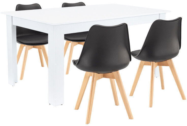 Lola Fekete-Fehér Étkezőgarnitúra (4+1) - Stílus és Kényelem Egyben! ?️ Ez a modern étkezőgarnitúra tökéletes választás otthonodba, éttermedbe vagy akár irodádba is. A szett 4 darab Silla étkezőszéket és egy Yorki étkezőasztalt tartalmaz, melyek harmonikus kombinációja eleganciát és funkcionalitást biztosít. Főbb jellemzők:Modern design: A fekete-fehér színkombináció időtálló és könnyen illeszkedik bármilyen enteriőrbe. Praktikus méret: Ideális 4 fő számára, közepes méretű helyiségekbe is tökéletesen passzol. Könnyű tisztítás: A felületek egyszerűen tisztíthatóak, így a mindennapi használat során is praktikus. Silla Étkezőszék:Ülőfelület: Prémium minőségű polipropilén, ami könnyen tisztítható. Lábak: Bükkfa színű, tartós faanyagból készültek. Kényelem: Szintetikus textil (PVC) párnázat a hosszan tartó komfortért. Teherbírás: 120 kg Méretek: Magasság: 81 cm Szélesség: 49 cm Ülésmélység: 43 cm Ülőmagasság: 45 cmYorki Étkezőasztal:Asztallap: Magas minőségű, kopásálló bútorlap. Felület: Elegáns fehér mintázat. Kivitelezés: Precíz élzárás és strapabíró szerkezet. Méretek: Hosszúság: 160 cm Szélesség: 90 cm Magasság: 76 cmEz a garnitúra nem csak stílusos, de rendkívül praktikus is. A könnyen tisztítható felületek és a strapabíró anyagok hosszú élettartamot garantálnak. Tökéletes választás azok számára, akik egy modern, időtálló és funkcionális étkezőt szeretnének kialakítani. ✨