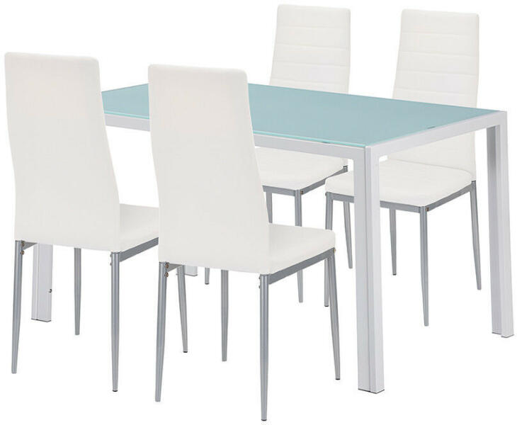 Mabel Fehér-Szürke 4+1 Étkezőgarnitúra - Modern elegancia a mindennapokban ?️ A Mabel 4+1 étkezőgarnitúra tökéletes választás, ha stílusos, kényelmes és praktikus étkezőt szeretnél. A modern design és a letisztult vonalak bármely otthonba könnyedén beilleszthetők. Főbb jellemzők:Asztal mérete: 140 × 80 × 74 cm Asztallap: 8 mm vastag, edzett üveg - strapabíró és könnyen tisztítható ✨ Asztal lábai: Fehér porfestett fém - stabil és időtálló ? Szék mérete: 50 × 41 × 96 cm (ülőmagasság: 45 cm) Szék anyaga: Fehér textilbőr ülőfelület, szürke vasláb - kényelmes és stílusos ? Szék színe: Fehér-szürke - könnyen kombinálható más színekkel Terhelhetőség (szék): max. 130 kg - biztonságos és megbízhatóFérőhely: max. 6 fő - ideális családi étkezésekhez ?‍?‍?‍? Miért válaszd a Mabel étkezőgarnitúrát?Modern design: Letisztult vonalak és elegáns színkombináció. Helytakarékos: Ideális kisebb étkezőkbe is. Strapabíró anyagok: Hosszú élettartamra tervezve. Könnyű tisztíthatóság: Az üvegasztal és a textilbőr székek egyszerűen tisztán tarthatók. Kinek ajánljuk? Akik modern és világos étkezőt szeretnének. Akiknek fontos a helytakarékosság. Akik tartós és megbízható bútort keresnek. Akik szeretik a praktikus, mégis elegáns megoldásokat. Alakítsd át étkeződet a Mabel 4+1 étkezőgarnitúrával! ✨