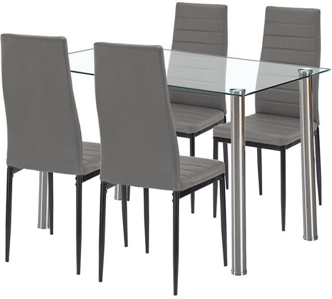 Mateo 4+1 Étkezőgarnitúra: Modern elegancia a mindennapi étkezésekhez ?️ A Mateo 4+1 étkezőgarnitúra tökéletes választás, ha egy stílusos, modern és praktikus étkezőt szeretnél. A szett tartalmaz egy Berna üveg étkezőasztalt és négy Tino NOVA étkezőszéket, amelyek együtt egy harmonikus és elegáns egészet alkotnak. Az asztal:Berna 120 cm üveg étkezőasztal: A minimalizmus és a minőség találkozása. Edzett üveglap: 8 mm vastag, hőkezelt üveg, amely ellenáll a karcolásoknak és ütődéseknek. Könnyen tisztítható, így mindig ragyogó marad. Rozsdamentes acél lábak: Stabil alátámasztást biztosítanak és modern megjelenést kölcsönöznek az asztalnak. Műanyag padlóvédő gyűrűk: Megóvják a padlót a karcolásoktól. Méretek: 120 × 70 × 75 cm, ideális 4-6 fő részére. A székek:Tino NOVA étkezőszékek: A modern elegancia és a kényelem tökéletes kombinációja. Szürke textilbőr ülőfelület: Stílusos, puha és könnyen tisztítható. Fekete porfestett vaslábak: Masszív tartást biztosítanak. Méretek: 50 × 41 × 96 cm (ülőmagasság: 45 cm). Teherbírás: max. 130 kg. Kinek ajánljuk? Akik modern, letisztult étkezőt szeretnének. Kisebb és közepes méretű étkezőkbe, ahol fontos a helytakarékosság. Családoknak, akik időtálló, strapabíró bútort keresnek. Akik értékelik a könnyen tisztítható felületeket. Alakítsd át étkeződet egy stílusos és hívogató térré a Mateo 4+1 étkezőgarnitúrával! ✨