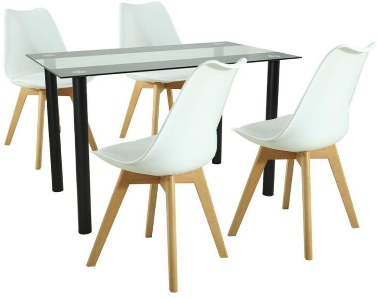 Merlo Fehér Étkezőgarnitúra (4 szék + 1 asztal) - Elegancia és Kényelem Egyben! ?️ Varázsolja étkezőjét stílusossá és modernné a Merlo étkezőgarnitúrával! Ez a szett tökéletes választás, ha egy letisztult, mégis elegáns megoldást keres. Főbb Jellemzők:Asztal: Riona ÉtkezőasztalDesign: Fekete, porszórással kezelt acél váz, edzett üveg asztallap Anyag: 8 mm vastag edzett üveg asztallap, acél váz Méretek: 120 cm x 70 cm x 75 cm Terhelhetőség: 60 kg Könnyen tisztítható üvegfelületSzékek: Silla Étkezőszék (4 db)Design: Fehér prémium polipropilén ülőfelület, bükkfa színű lábak, fehér PVC párnázat Anyag: Fehér PP ülőfelület, fehér PVC párnázat, bükkfa színű lábak Méretek: Magasság: 81 cm, Szélesség: 49 cm, Ülésmélység: 43 cm, Ülőmagasság: 45 cm Terhelhetőség: 120 kg / szék Kényelmes PVC párnázat Könnyen tisztíthatóMiért válaszd a Merlo étkezőgarnitúrát?Elegáns design: A fehér szín és a modern vonalvezetés bármilyen enteriőrbe illeszkedik. Tartósság: Minőségi anyagokból készült, így hosszú távon is megőrzi szépségét. Kényelem: A székek párnázott ülőfelülete extra komfortot biztosít. Praktikusság: Könnyen tisztítható felületek a mindennapi használatra. Ez a garnitúra nem csak egy étkezőszett, hanem otthonod stílusának meghatározó eleme. ✨