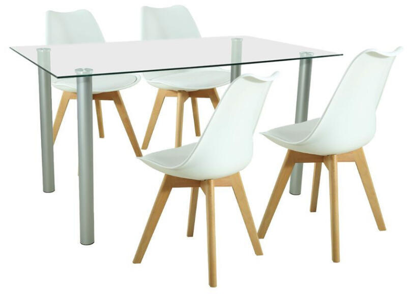 Midori 4+1 Étkezőgarnitúra - Modern elegancia a konyhádba! ?️ Varázsolj stílusos és meghitt hangulatot étkeződbe a Midori 4+1 étkezőgarnitúrával! Ez a modern design és a kiváló minőségű anyagok kombinációja tökéletes választás a családi étkezésekhez és baráti összejövetelekhez. A garnitúra egy Berna étkezőasztalból és négy Silla étkezőszékből áll. Berna Étkezőasztal: ✨ Modern és elegáns szögletes forma ? Tartós és karcálló hőkezelt üveglap (8 mm vastag) ?️ Fém lábak műanyag gyűrűkkel a padló védelmére ? Méretek: 140 cm (hossz) x 80 cm (szélesség) x 75 cm (magasság) ⚖️ Terhelhetőség: 60 kg Silla Étkezőszékek: ? Elegáns design: Fehér PP ülőfelület, PVC párnázat és bükkfa színű lábak ? Kényelmes ülés: PVC párnázás az extra komfortért ? Tartós anyagok: Könnyen tisztítható PP ülőfelület ? Bükkfa színű lábak: Természetes megjelenés ? Méretek: 81 cm (magasság), 49 cm (szélesség), 43 cm (ülésmélység), 45 cm (ülőmagasság) ⚖️ Terhelhetőség: 120 kg Miért válaszd a Midori étkezőgarnitúrát? ✅ Modern stílus: Tökéletesen illeszkedik a modern otthonokba. ? Könnyű tisztítás: Az asztal üveglapja és a székek ülőfelülete könnyen tisztítható. ?‍?‍?‍? Ideális méret: Kényelmesen elfér 4-5 személy. ? Tartós anyagok: Hosszú távon megőrzi szépségét és minőségét. Élvezd a közös étkezéseket stílusos és kényelmes környezetben a Midori étkezőgarnitúrával! ✨