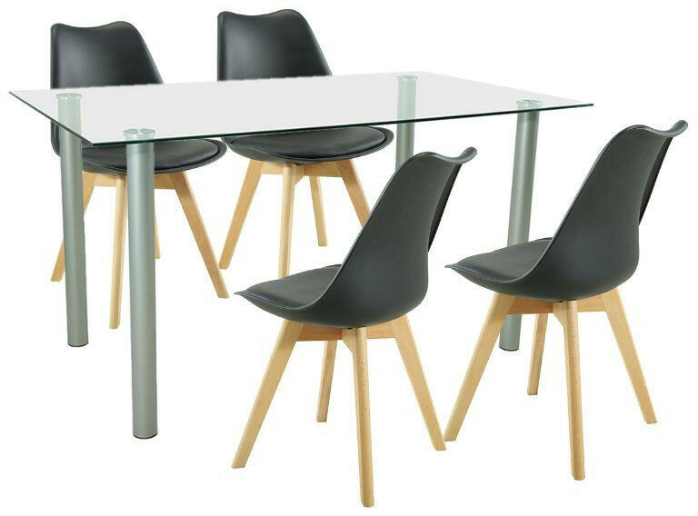 Midori Modern Étkezőgarnitúra (4 Szék + Asztal) Fekete - Stílus és Kényelem Egyben! ?️ A Midori étkezőgarnitúra tökéletes választás, ha modern és elegáns megjelenést szeretnél az étkeződbe. A garnitúra egy stílusos üveglapos asztalból és négy kényelmes székből áll, melyek harmonikus összhangot teremtenek. Az Asztal (Berna Étkezőasztal) Jellemzői: ✨ Modern és elegáns design: Szögletes forma, amely bármely étkezőbe illik. ? Tartós anyagok: Hőkezelt üveglap a karcolások ellen, fém lábak a stabilitásért. ?️ Padlóvédelem: Műanyag gyűrűk a lábak alján a padló védelmére. ? Ideális méretek: 140 cm hosszú, 80 cm széles és 75 cm magas. ? Terhelhetőség: Az asztal maximális terhelhetősége 60 kg. A Székek (Silla Étkezőszék) Jellemzői: ? Elegáns design: Fekete PP ülőfelület és PVC párnázat, bükkfa színű lábakkal. ? Kényelmes ülés: PVC párnázat az extra kényelemért. ? Természetes anyagok: Bükkfa színű lábak a természetes hatásért. ? Optimális méretek: 81 cm magas, 49 cm széles, 43 cm ülésmélység és 45 cm ülőmagasság. ? Terhelhetőség: A szék maximális terhelhetősége 120 kg. Miért válaszd a Midori étkezőgarnitúrát? ✅ Modern stílus: Tökéletesen illeszkedik a modern otthonokba. ✅ Kényelmes használat: A székek kényelmesek, az asztal pedig praktikus. ✅ Tartós anyagok: Hosszú élettartamra tervezve. ✅ Könnyen tisztítható: Az üveglap és a PP ülőfelület könnyen tisztítható. Varázsold stílusossá étkeződet a Midori étkezőgarnitúrával! ✨