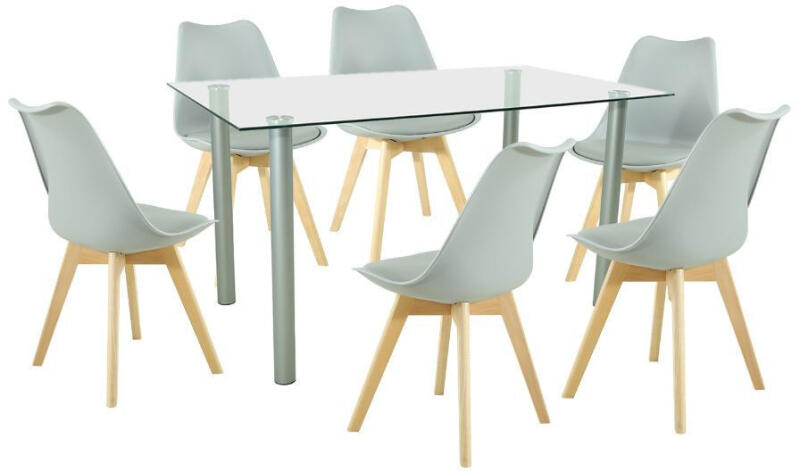 Midori szürke étkezőgarnitúra (6 szék + asztal) - Modern elegancia a mindennapokban! ?️ A Midori 6+1 étkezőgarnitúra tökéletes választás, ha modern stílust és kényelmet szeretnél az étkeződbe. A szürke színvilág és a letisztult design bármely otthonba könnyen beilleszthető. A garnitúra tartalma: 1 db Berna étkezőasztal 6 db Silla étkezőszék Berna étkezőasztal - A modern elegancia megtestesítője:Asztallap: Hőkezelt üveg (8 mm vastag) Lábak: Fém, műanyag gyűrűkkel a padló védelmére Méret: 140 cm (hossz) x 80 cm (szélesség) x 75 cm (magasság) Terhelhetőség: 60 kg Tulajdonságok: Karcolásálló hőkezelt üveg Könnyen tisztítható Stabil és tartós szerkezetSilla étkezőszék - Kényelem és stílus egyben:Ülőfelület: Szürke PP (polipropilén) ülőfelület szürke PVC párnázattal Lábak: Bükkfa színű Méret: 81 cm (magasság) x 49 cm (szélesség) x 43 cm (ülésmélység) x 45 cm (ülőmagasság) Terhelhetőség: 120 kg Tulajdonságok: Kényelmes PVC párnázat Tartós és könnyen tisztítható anyagok Stílusos színvilágMiért válaszd a Midori étkezőgarnitúrát?Modern design: Letisztult vonalak és elegáns szürke szín. Kényelem: A székek kényelmes ülőfelülettel rendelkeznek. Tartósság: Minőségi anyagokból készült, hosszú élettartam. Könnyű tisztítás: Az asztal és a székek is könnyen tisztán tarthatók. Ideális méret: Tökéletes választás kisebb és nagyobb étkezőkbe is. Varázsold otthonod stílusos és meghitt helyszínévé a Midori étkezőgarnitúrával! ✨