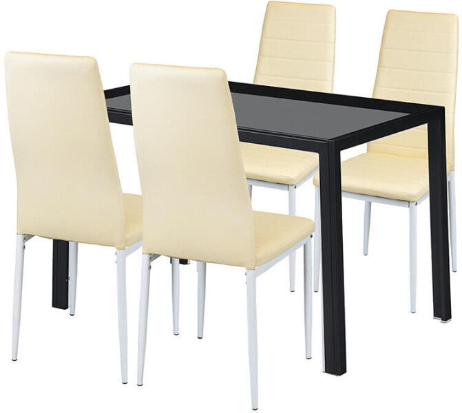 Nicole Bézs Étkezőgarnitúra (4+1) - Elegáns és Praktikus Étkezés ?️ A Nicole 4+1 étkezőgarnitúra tökéletes választás azok számára, akik egy stílusos, modern és funkcionális étkezőt szeretnének. A bézs színvilág eleganciát sugároz, míg az edzett üvegasztal és a kényelmes székek garantálják a mindennapi komfortot. Főbb jellemzők:Asztal mérete: 120 × 70 × 74 cm Asztallap: 8 mm vastag, hőkezelt, edzett füstszürke üveg - karcálló és könnyen tisztítható ✨ Asztal lábai: Bézs festett vas, padlóvédő műanyag talpakkal - stabil és tartós ? Szék mérete: 50 × 41 × 96 cm (ülőmagasság: 45 cm) Szék anyaga: Bézs textilbőr ülőfelület, fehér fém lábak - kényelmes és könnyen tisztítható ? Színkombináció: Teljesen bézs Szék teherbírása: max. 130 kg Férőhely: 4–6 fő Az asztal - Leziter Clara 120 cm üveg étkezőasztal: A garnitúra központi eleme a Leziter Clara asztal, melynek füstszürke üveglapja modern és elegáns megjelenést kölcsönöz. A hőkezelt üveg ellenáll a karcolásoknak és a mindennapi használatból eredő terheléseknek. A bézs festett vas lábak masszív tartást biztosítanak. A székek - Tino NOVA étkezőszékek: A Tino NOVA étkezőszékek bézs textilbőr bevonata elegáns és könnyen tisztítható. A magas háttámla és a megfelelő ülőmagasság kényelmes ülést biztosítanak. A fehér porszórt fém lábak stabilak és stílusosak. Kinek ajánljuk? Akik modern, egyszínű bézs étkezőbútorra vágynak. Kisebb és közepes méretű étkezőkbe vagy konyhákba. Akik szeretik az edzett üveg eleganciáját és tartósságát. Akik fontosnak tartják a könnyű tisztíthatóságot és a stabil kialakítást. Családoknak, pároknak vagy modern irodai környezetbe is kiváló választás. Összefoglalva: A Nicole 4+1 étkezőgarnitúra egy elegáns, tartós és kényelmes bútordarab, mely tökéletesen illeszkedik a modern otthonokba. Rendeld meg most, és tedd stílusosabbá étkeződ minden napját! ✨