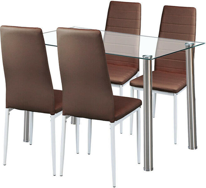 Nolen Barna 4+1 Étkezőgarnitúra: Modern elegancia az otthonodba! ? A Nolen 4+1 étkezőgarnitúra tökéletes választás, ha stílusos és funkcionális étkezőre vágysz. A barna székek és az edzett üveg asztal kombinációja modern és elegáns megjelenést kölcsönöz otthonodnak. Főbb jellemzők:Asztal: Méretek: 120 × 70 × 75 cm Asztallap: 8 mm vastag, edzett üveg - strapabíró és könnyen tisztítható ✨ Lábak: Rozsdamentes fém, padlóvédő gyűrűkkel a karcolások elkerülése érdekébenSzékek: Méretek: 50 × 41 × 96 cm (ülőmagasság: 45 cm) Anyag: Textilbőr kárpit - kényelmes és könnyen tisztítható Szín: Barna Teherbírás: max. 130 kgFérőhely: 4-6 fő számára ideális Miért válaszd a Nolen étkezőgarnitúrát?Modern design: Letisztult vonalak és elegáns megjelenés. Strapabíró anyagok: Hosszú élettartam és megbízhatóság. Kényelmes használat: Ergonomikus székek és praktikus asztal. Helytakarékos: Kisebb lakásokba is ideális. Könnyen tisztítható: Az üveg asztallap és a textilbőr székek egyszerűen karbantarthatók. A Nolen 4+1 étkezőgarnitúra tökéletes választás: Ha modern stílusú étkezőre vágysz. Ha fontos számodra a strapabíróság és az elegancia. Ha helytakarékos megoldást keresel. Ha egy megbízható és hosszú élettartamú bútort szeretnél. Teremts stílusos és elegáns hangulatot otthonodban a Nolen 4+1 étkezőgarnitúrával! ✨