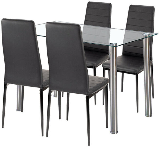 Nolen Fekete Étkezőgarnitúra 4+1: Modern elegancia az otthonodba! ? A Nolen 4+1 étkezőgarnitúra tökéletes választás, ha egy stílusos és praktikus étkezőt szeretnél. A fekete székek és az edzett üvegasztal kombinációja modern és elegáns megjelenést kölcsönöz az otthonodnak. A garnitúra tartalma: 1 db Berna 120 cm-es üveg étkezőasztal 4 db Tino NOVA fekete étkezőszék Az asztal jellemzői: Méretek: 120 × 70 × 75 cm Asztallap: 8 mm vastag, hőkezelt, edzett üveg - strapabíró és könnyen tisztítható ✨ Lábak: Rozsdamentes fém lábak padlóvédő gyűrűkkel - stabilitást és védelmet biztosítanak A székek jellemzői: Méretek: 50 × 41 × 96 cm (ülőmagasság: 45 cm) Anyag: Textilbőr kárpit - kényelmes és könnyen tisztítható Szín: Fekete Teherbírás: max. 130 kg Váz: Fém Kinek ajánljuk? Akik modern és stílusos étkezőre vágynak. Akik értékelik a minőségi anyagokat (üveg, fém, textilbőr). Kisebb és közepes méretű otthonokba, ahol fontos a helytakarékosság. Családoknak és pároknak, akik megbízható bútort keresnek. Akik szeretik a fekete eleganciáját. Teremts karakteres és elegáns hangulatot otthonodban a Nolen 4+1 étkezőgarnitúrával! ?