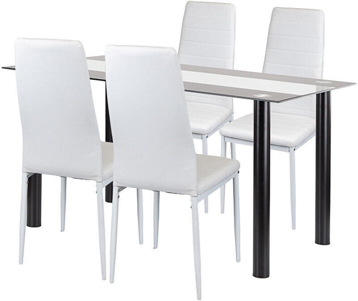 Leziter Norman Étkezőgarnitúra (4+1) - Modern Elegancia a Konyhádba ?️ A Leziter Norman 4+1 étkezőgarnitúra a modern minimalizmus és a praktikus funkcionalitás tökéletes kombinációja. A szett tartalmaz egy Leziter Riona étkezőasztalt és négy Tino NOVA étkezőszéket, melyek együtt letisztult és stílusos megjelenést kölcsönöznek étkeződnek. Az asztal főbb jellemzői:Leziter Riona 140 cm-es étkezőasztalFüstszürke, 8 mm vastag edzett üveglap: Elegáns és könnyen tisztítható. Fekete porszórt acél váz: Stabilitást és tartósságot biztosít. Méretek: 140 × 80 × 75 cm Terhelhetőség: 60 kg A székek főbb jellemzői:Tino NOVA étkezőszékek (4 db)Fehér textilbőr ülőfelület: Kényelmes és könnyen tisztítható. Fém szerkezet: Hosszú távú stabilitást garantál. Méretek: 50 × 41 × 96 cm (ülőmagasság: 45 cm) Teherbírás: max. 130 kg Kinek ajánljuk? Akik elegáns és modern étkezőgarnitúrát keresnek. Akik számára fontos a könnyű tisztíthatóság és a tartós anyaghasználat. Családoknak és pároknak, akik kényelmes és stílusos étkezőt szeretnének. Modern és minimalista otthonokba tökéletes választás. Dobd fel étkeződet a Leziter Norman 4+1 étkezőgarnitúrával, és élvezd a stílusos és kényelmes étkezéseket minden nap! ✨