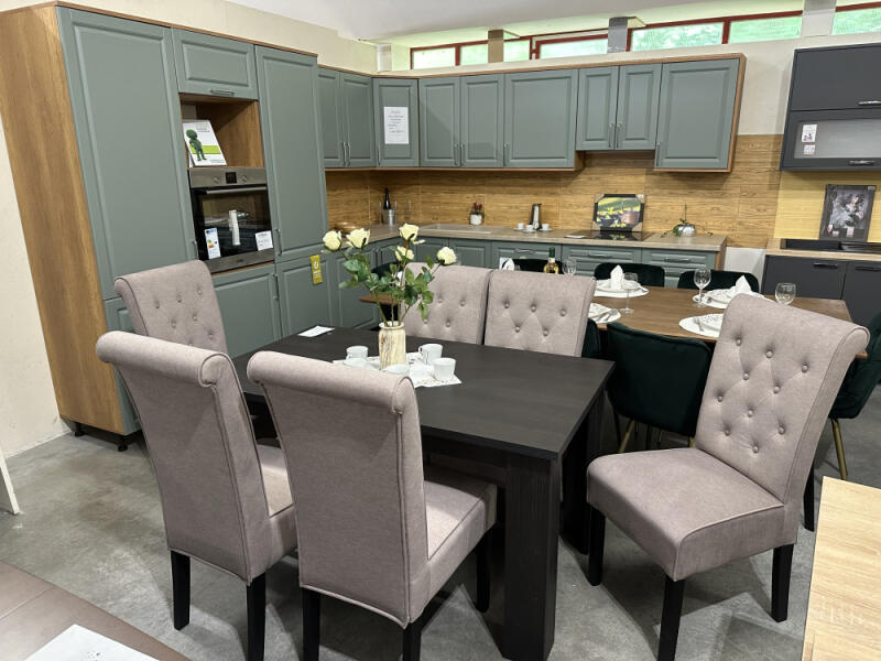 Étkezőgarnitúra kép szerinti összeállításban. Az ár az asztalt és a 6 darab széket tartalmazza. Az asztal tovább bővíthető. Kép szerinti színben. Asztal mérete: hosszúság: 138 cm szélesség: 82 cm magasság: 75,3 cm nyitott állapotban: 177,2 cm Szék mérete: hosszúság: 52 cm magassága: 104 cm, ülésszélesség: 52 cm ülésmélység: 46 cm