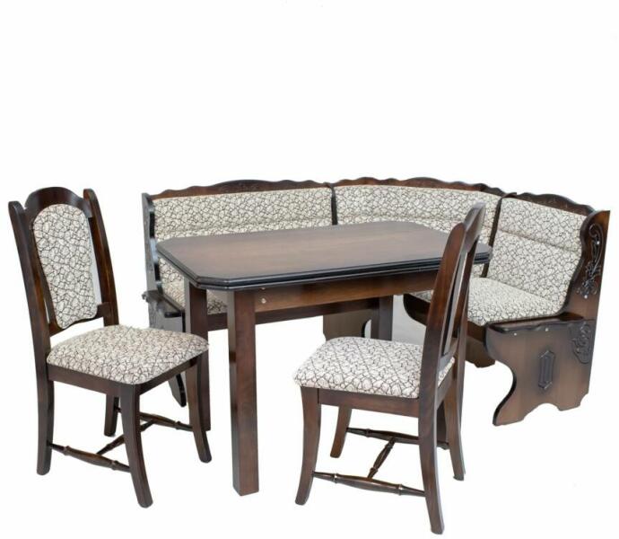 Konyhabútor, étkezőbútor > Étkezőgarnitúra - Spandau clasic konyhai étkező sarok kinyitható asztallal és 2 db székkel. Az ülőfelület alatt tároló rekesz található!  Számtalan színösszeállításban rendelhető .    Furnérozott MDF asztallap, furnérozott pad és tömör bükkfa székek.    Az étkezőszék 6 színben elérhető: cseresznye, sötét tölgy, világos tölgy, mahagóni,   wenge,   dió, fehér  Dió szín esetében a felár: +5 % A garnitúra már kérhető fehér színben is 10% felár ellenében. Színminták megtekintéséhez kérjük kattints ide. A kárpit választható: 27 db textilbőr, 21 db szövet és 3 db zsákszövet  Kárpitminták megtekintéséhez kérjük kattints ide.     Sarokülő méretei: Ülőfelület magasság: 49 cm Háttámla magasság: 87 cm Helyigény: 153 cm x 114 cm Asztal méretei: Magasság: 76 cm Helyigény: 65 cm x 100 cm Helyigény bővítve: 65 cm x 170 cm Igény esetében Elfi székkel is kérhető: Szék méretei: Ülőfelület magasság: 48 cm Helyigény: 45 cm x 50 cm Háttámla magassága : 93 cm  Kérhető a képen látható Vlad székkel is: Méretei:    Háttámla Magasság: 100 cm  Ülőfelület Szélessége: 46 cm  Ülőfelület Mélysége: 50 cm  Ülőfelület Magassága: 48 cm