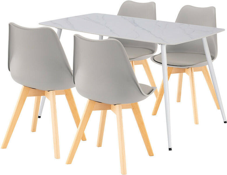 Ravena Fehér-Szürke Étkezőgarnitúra 4+1: Stílus és Tartósság Egyben! ?️ A Ravena 4+1 étkezőgarnitúra tökéletes választás, ha modern, elegáns és praktikus étkezőbútort keresel. A szett egy Bora szinterezett kő asztalból és négy Silla székből áll, így ideális 4-6 fős családoknak vagy baráti összejövetelekhez. Az asztal főbb jellemzői:Méret: 140 x 80 x 75 cm Anyag: Szinterezett kő (Stoneis technológia) - karcálló, foltálló és hőállóFelület: Palakő hatású, természetes textúra Lábak: Fehérre festett fém, műanyag padlóvédőkkel Kapacitás: 4-6 fő Stílus: Modern, minimalista A székek főbb jellemzői:Szín: Szürke Anyag: Polipropilén (PP) ülőfelület, szürke PVC párnázat Lábak: Bükkfa színű Méretek: Magasság 81 cm, szélesség 49 cm, ülésmélység 43 cm, ülőmagasság 45 cm Teherbírás: 120 kg Kényelem: Könnyen tisztítható, extra kényelmet nyújtó párnázat Miért válaszd a Ravena étkezőgarnitúrát?Tartósság: A szinterezett kő asztallap ellenáll a mindennapi használatnak, a karcolásoknak, foltoknak és a hőnek. Kényelem: A Silla székek ergonomikus kialakítása és párnázott ülőfelülete biztosítja a kényelmes étkezést. Stílus: A fehér asztal és a szürke székek kombinációja modern és elegáns megjelenést kölcsönöz az étkezőnek. Praktikusság: Az asztal mérete ideális 4-6 fő számára, így tökéletes családi vacsorákhoz és vendéglátáshoz. Könnyű tisztítás: Mind az asztal, mind a székek könnyen tisztíthatók, így a mindennapi használat során is praktikusak. Kinek ajánljuk? Akik modern és tartós étkezőbútort keresnek. Kisebb és közepes méretű otthonokba, ahol fontos a helytakarékos, de kényelmes megoldás. Családoknak és pároknak, akik tartós, kényelmes és praktikus étkezőszettet keresnek. Tedd otthonodat elegánsabbá és kényelmesebbé a Ravena étkezőgarnitúrával! ✨