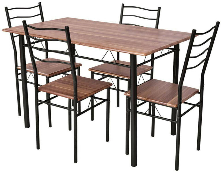 Időtlen elegancia: Fém és fa étkezőgarnitúra 4 székkel Ez a stílusos étkezőgarnitúra tökéletes választás modern otthonokba és éttermekbe egyaránt. A fekete fémváz és a barna fa asztallap elegáns kontrasztot alkot, kellemes és természetes hangulatot teremtve. A 4 db kényelmes szék tökéletesen illeszkedik az asztalhoz, biztosítva a kényelmes étkezést. A kiváló ár-érték aránynak köszönhetően kiváló választás mindenkinek, aki stílusos és praktikus étkezőgarnitúrát keres. Főbb jellemzők:Anyag: Strapabíró fémváz és tartós fa asztallap Szín: Fekete fémváz, barna fa asztallap Méretek: Asztal: 110x70 cm Asztallap: 110x70x2 cm Asztal magassága: 73,5 cm Szék ülőfelület: 40x39 cm Szék háttámla: 48x38,5 cm Ülésmagasság: 43 cmSzékek száma: 4 db Szék teherbírása: max 100 kg Kiváló ár-érték arány: A vásárlók kiemelték a termék kedvező árát és kiváló minőségét. A tökéletes választás: Ez az étkezőgarnitúra nem csak stílusos, de rendkívül praktikus is. A masszív felépítésnek köszönhetően hosszú éveken át fogja szolgálni Önt és családját. A vevői visszajelzések alapján a termék kiváló minőségű és tartós. Élvezze a kényelmes étkezést ebben a modern és elegáns garnitúrában!
