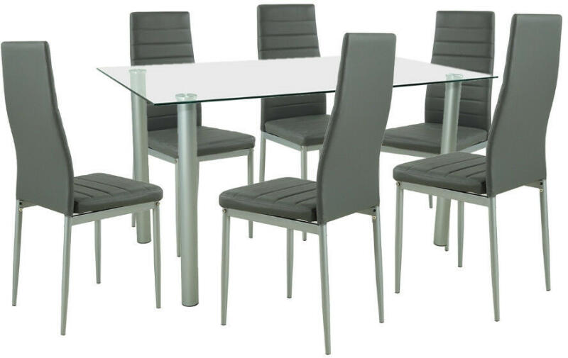 Verna 6+1 Szürke Étkezőgarnitúra - Stílus és Kényelem Egyben! ?️ Varázsolja étkezőjét modern és elegáns térré a Verna 6+1 étkezőgarnitúrával! Ez a szett tökéletes választás családi étkezésekhez és baráti összejövetelekhez. A szürke színkombináció időtlen eleganciát sugároz, könnyen illeszkedve bármilyen enteriőrbe. A garnitúra tartalma: 1 db Berna étkezőasztal 6 db Tino NOVA étkezőszék Berna Étkezőasztal - Modern EleganciaDesign: Modern, szögletes forma Anyag: Hőkezelt üveglap, fém lábak Szín: Átlátszó üveglap, fémes elemek Méretek: Magasság: 75 cm Hossz: 140 cm Szélesség: 80 cmTartósság: Karcolásálló hőkezelt üveg, tartós fém lábak Terhelhetőség: 60 kg Asztallap vastagsága: 8 mm edzett üveg Padlóvédelem: A lábak alján műanyag gyűrűk védik a padlót a sérülésektől. Tino NOVA Étkezőszék - Kényelem és StílusDesign: Elegáns, modern Anyag: Szürke színű ülőfelület, szürke porfestett vas lábak Szín: Szürke ülőfelület, szürke lábak Méretek: Magasság: 96 cm Szélesség: 50 cm Mélység: 41 cm Ülőmagasság: 45 cmTartósság: Tartós anyagok, kényelmes és strapabíró ülőfelület Terhelhetőség: 130 kg Főbb előnyök: ✅ Modern és elegáns design, amely bármely étkezőbe illeszkedik. ? Tartós anyagok, amelyek hosszú élettartamot biztosítanak. ? Könnyen tisztítható felületek. ?‍?‍?‍? Ideális méret családi étkezésekhez. ?️ Stabil szerkezet a biztonságos használatért. Élvezze a stílusos és kényelmes étkezéseket a Verna 6+1 étkezőgarnitúrával! ✨