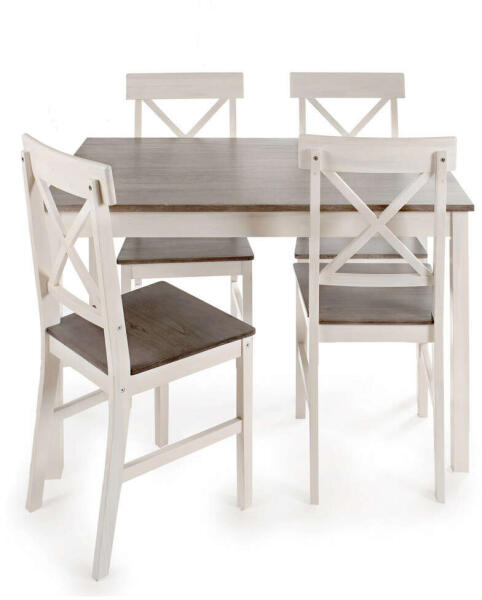 Vidéki stílusú étkezőgarnitúra 4 személyre: Elegáns és praktikus megoldás a mindennapokra ? Ez a gyönyörű, vidéki stílusú étkezőgarnitúra tökéletes választás azoknak, akik szeretik a rusztikus hangulatot, de nem szeretnének lemondani a modern kényelemről. Az asztal és a négy szék nyárfa fából készültek, fehér és szürke színben pompáznak, így könnyedén illeszkednek bármilyen enteriőrbe. Főbb jellemzők:Anyag: Nyárfa fa Szín: Fehér és szürke Méretek: Asztal: 118 x 74 x 73 cm Szék: 43 x 94 x 47,5 cmDarabszám: 1 asztal + 4 szék Stílus: Vidéki, rusztikus Miért válaszd ezt az étkezőgarnitúrát?Tökéletes méret: Kényelmesen elfér körülötte 4 személy. Elegáns design: A vidéki stílusú dizájn melegséget és hangulatot kölcsönöz az étkezőnek. Minőségi anyagok: A tartós nyárfa fa biztosítja a hosszú élettartamot. Könnyű tisztíthatóság: A sima felületek könnyen tisztíthatók. Élvezd a családi vacsorákat ebben a gyönyörű étkezőgarnitúrában! ✨