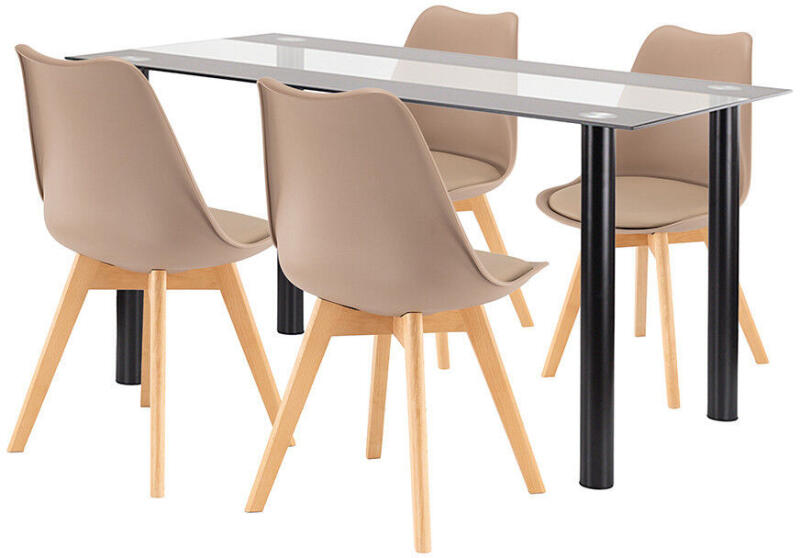 Leziter Zelma Étkezőgarnitúra - Fekete Üveg Asztal Bézs Székekkel - 4 Személyes ?️ A Leziter Zelma étkezőgarnitúra tökéletes választás, ha modern és stílusos étkezőt szeretnél. Az elegáns fekete üveg asztal és a kényelmes bézs székek harmonikus kombinációja bármely otthonba illik. A szett tartalma: 1 db Riona 140 cm-es üveg étkezőasztal 4 db Silla bézs étkezőszék Riona Étkezőasztal Főbb Jellemzői:Méret: 140 × 80 × 75 cm Asztallap: 8 mm vastag edzett üveg - karcálló és könnyen tisztítható ✨ Váz: Fekete, porszórt acél - stabil és tartós ? Teherbírás: 60 kg Design: Letisztult, időtálló Silla Étkezőszék Főbb Jellemzői:Szín: Bézs Anyag: Polipropilén (PP) ülőfelület, bézs PVC párnázat - kényelmes és könnyen tisztítható ? Lábak: Bükkfa színű - stabil és természetes hatású ? Méretek: Magasság 81 cm, Szélesség 49 cm, Ülésmélység 43 cm, Ülőmagasság 45 cm Teherbírás: 120 kg Kényelem: Extra kényelmet nyújtó párnázat Miért válaszd a Zelma étkezőgarnitúrát?Modern design: A fekete üveg asztal és a bézs székek elegáns kontrasztot alkotnak. Tartósság: Minőségi anyagokból készült, hosszú élettartamra tervezve. Kényelem: A székek ergonomikus kialakítása és párnázása kényelmes ülést biztosít. Könnyű tisztítás: Az üveg asztallap és a műanyag székek könnyen tisztán tarthatók. Ideális méret: A 140 cm-es asztal 4-6 személy számára is kényelmes. Kinek ajánljuk? Akik modern és letisztult étkezőbútort keresnek. Kisebb és közepes méretű otthonokba, ahol fontos a helytakarékosság. Családoknak és pároknak, akik mindennapi használatra is kényelmes étkezőgarnitúrát szeretnének. Rendeld meg most a Leziter Zelma étkezőgarnitúrát, és varázsold étkeződet stílusosabbá és kényelmesebbé!